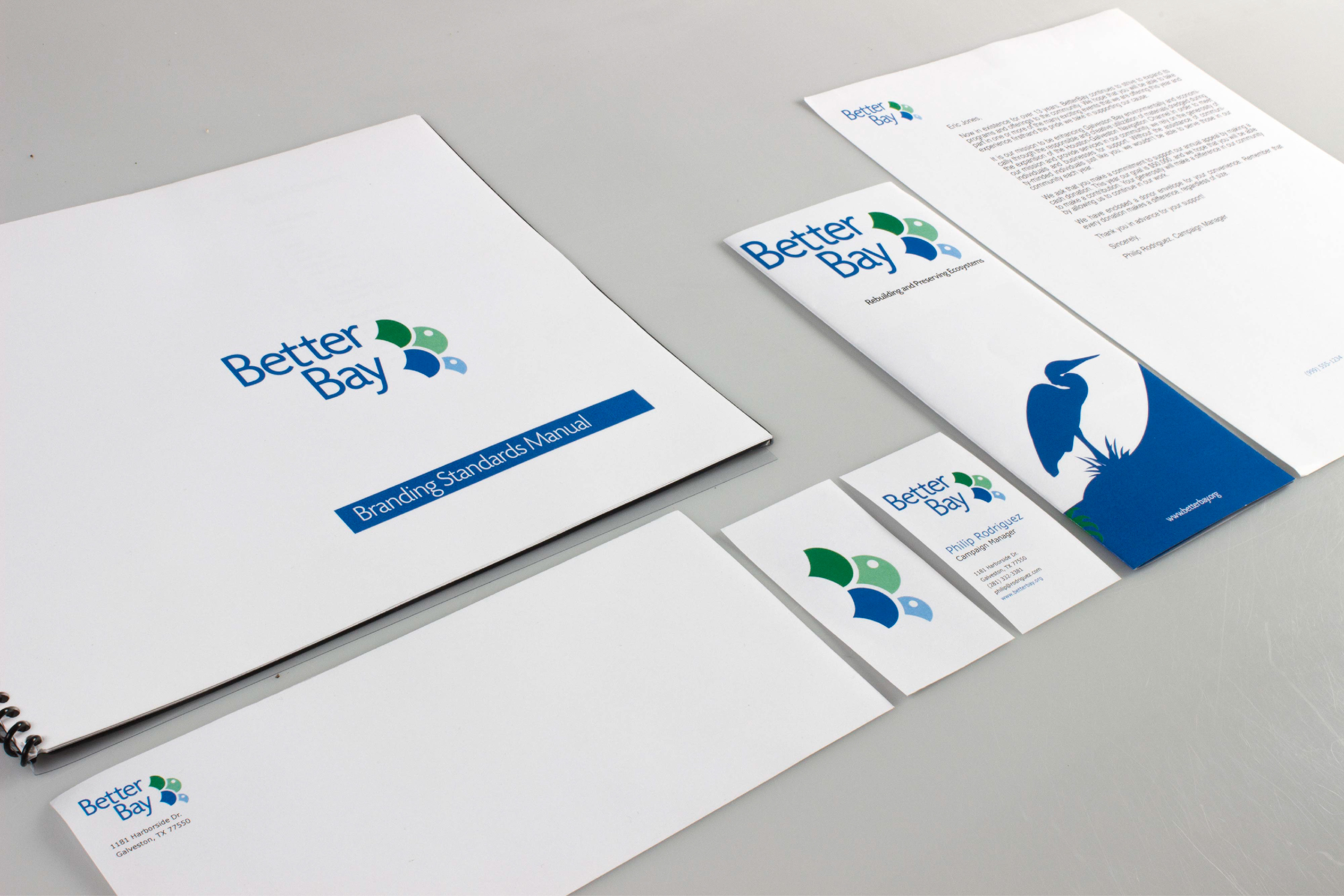 A proposed re-brand for the non-profit organization BetterBay. Identity systems include business cards, letterhead, envelopes, standard manuals, and marketing materials.